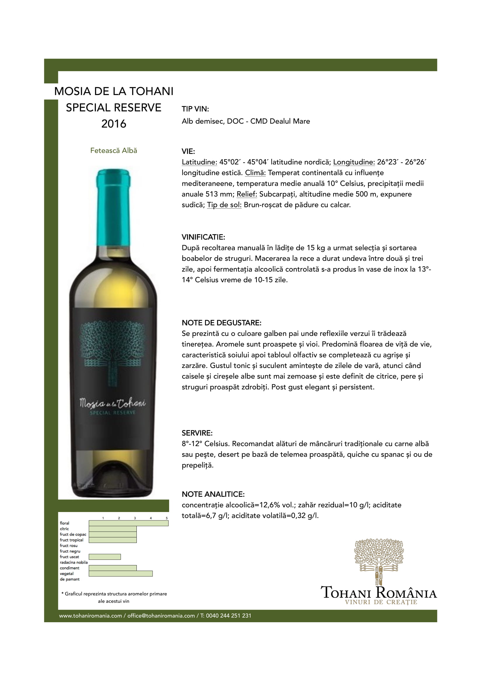 Feteasca Regală este unul dintre cele mai populare soiuri de struguri din România, născut din împletirea Grasei de Cotnari cu Fetească Albă cu opt secole în urmă, în regiunea Transilvaniei. Acest soi delicios stă la baza acestui Vin Mosia Tohani Special Reserve Feteasca Regala 0.75L , originar din regiunea controlată Dealu Mare.
