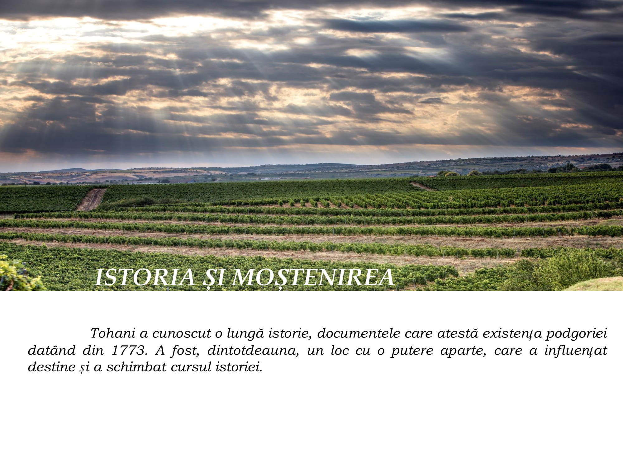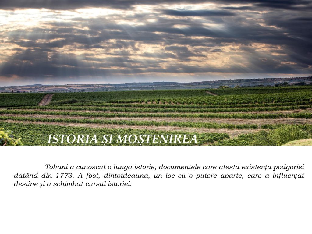 Tohani a cunoscut o lungă istorie, documentele care atestă existența podgoriei datând din 1773.