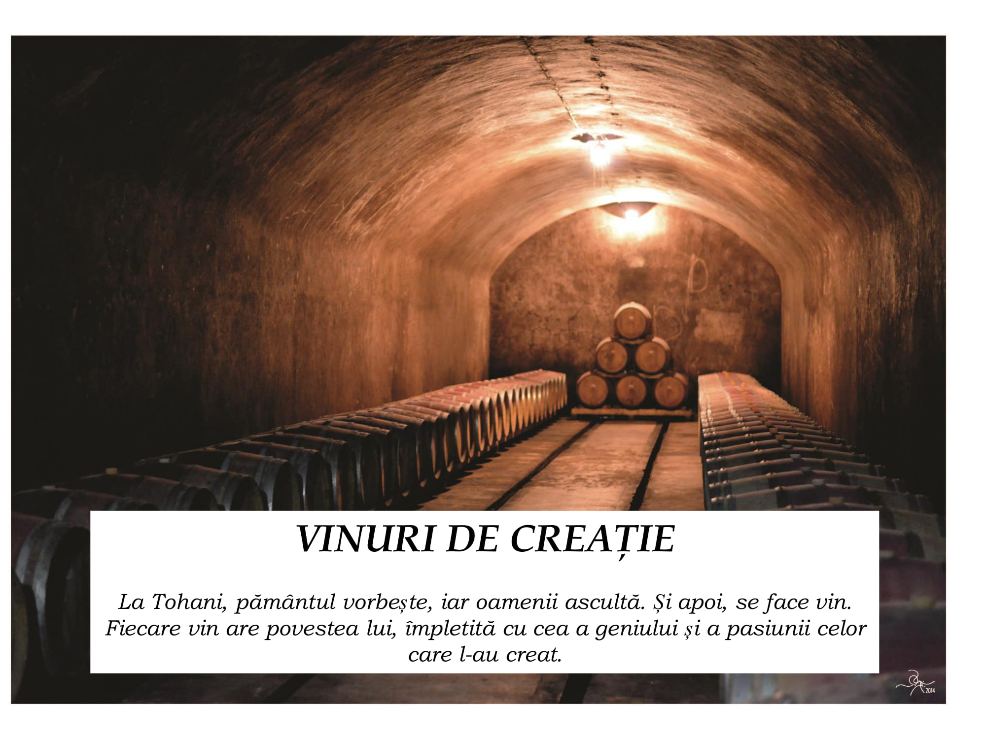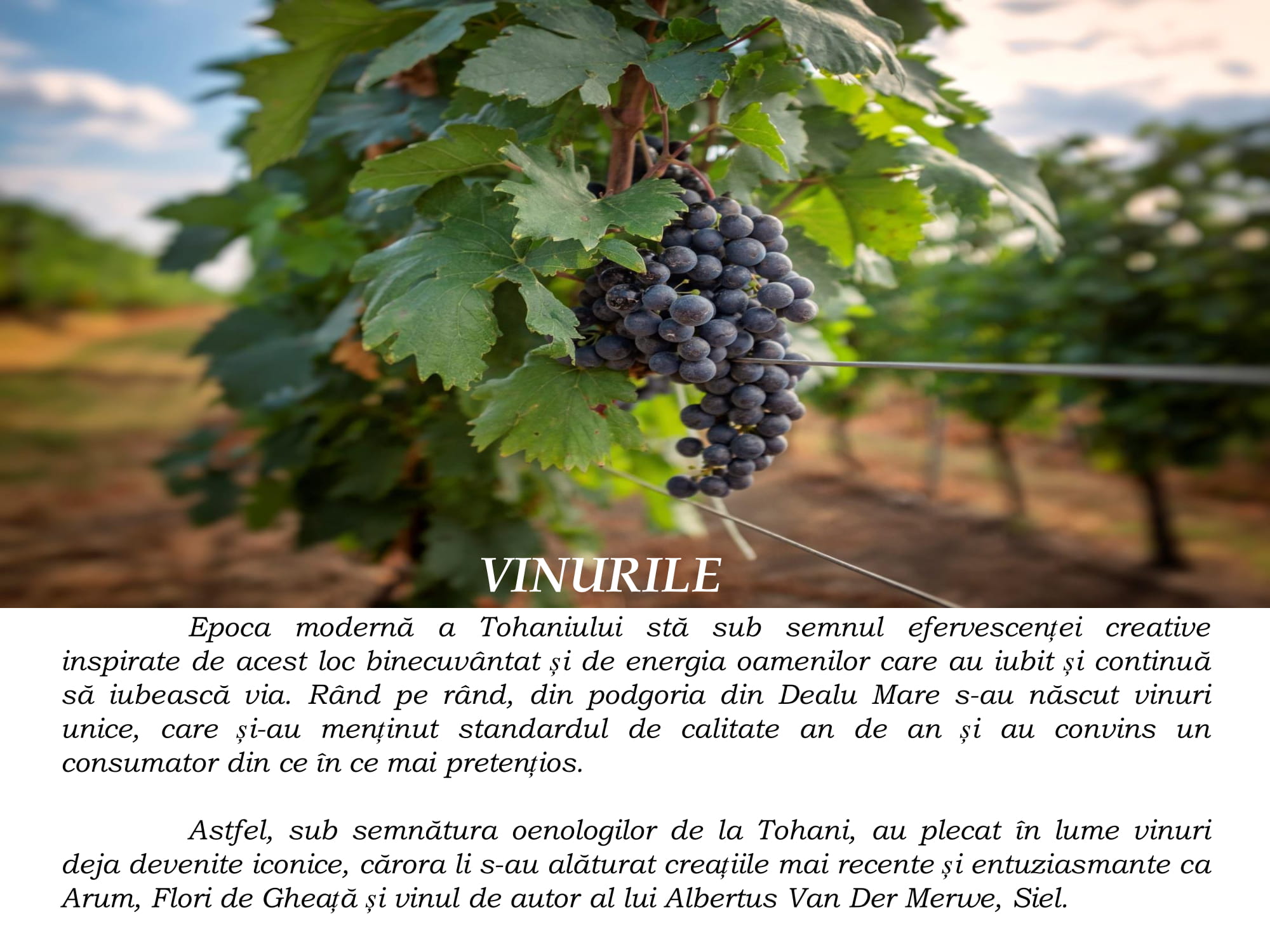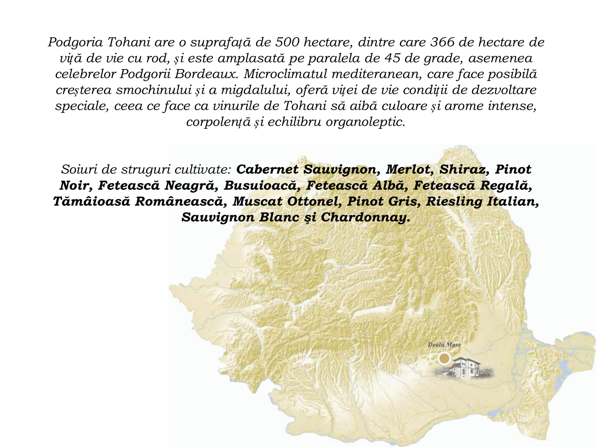 Podgoria Tohani are o suprafață cultivată de 365 de hectare și este amplasată pe paralela de 45 de grade, asemenea celebrelor Podgorii Bordeaux. Microclimatul mediteranean, care face posibilă creșterea smochinului și a migdalului, oferă viței de vie condiții de dezvoltare speciale, ceea ce face ca vinurile de Tohani să aibă culoare și arome intense, corpolență și echilibru organoleptic.Fiecare vin are povestea lui, împletită cu cea a geniului și a pasiunii celor care l-au creat.